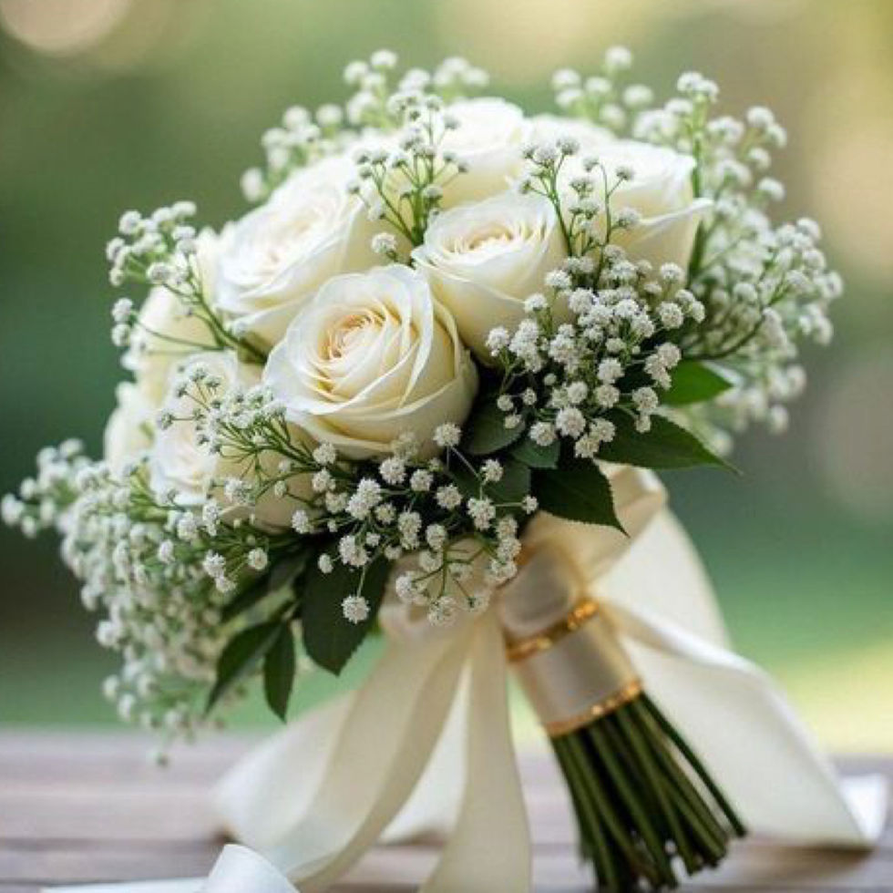Crafted with premium imported white roses, this elegant bouquet radiates purity and sophistication. Accented with delicate baby’s breath and finished with flowing ivory ribbon, it embodies timeless romance and refined beauty. Perfect for the bride seeking a graceful and classic touch, this bouquet makes a stunning statement while complementing any wedding style.