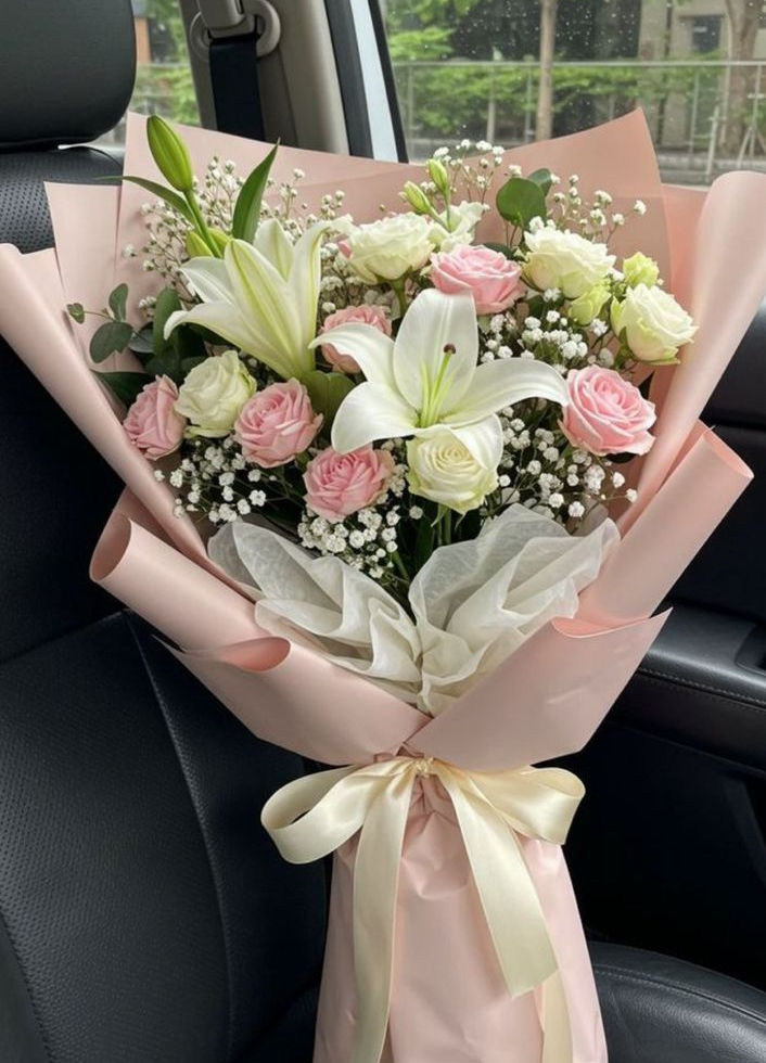 A show-stopping bouquet designed for special occasions, featuring vibrant pink lilies paired with soft blush roses and accented with seasonal blooms and fresh greenery. Wrapped in elegant pink paper with gold-edged detailing and finished with a cascading satin ribbon bow, this presentation bouquet is perfect for graduations, award ceremonies, or grand gestures of love and appreciation. Its bold yet graceful style makes it a memorable gift that leaves a lasting impression.