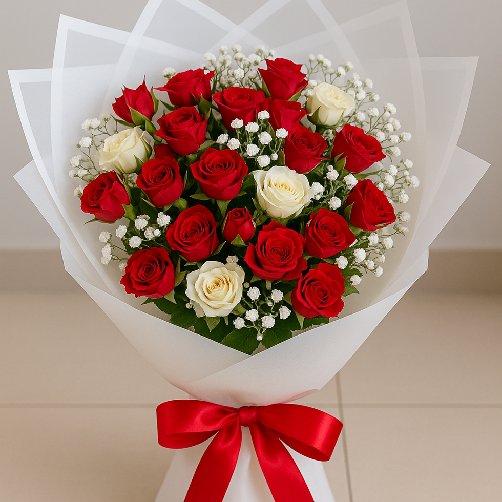 A Small/Cute graceful arrangement of red and white baby roses (spray roses), paired with delicate baby’s breath (gypsophila) for a soft, romantic finish. Featuring clusters of charming small blooms and buds, this bouquet is carefully wrapped in crisp white floral paper and tied with a bold red satin bow.
